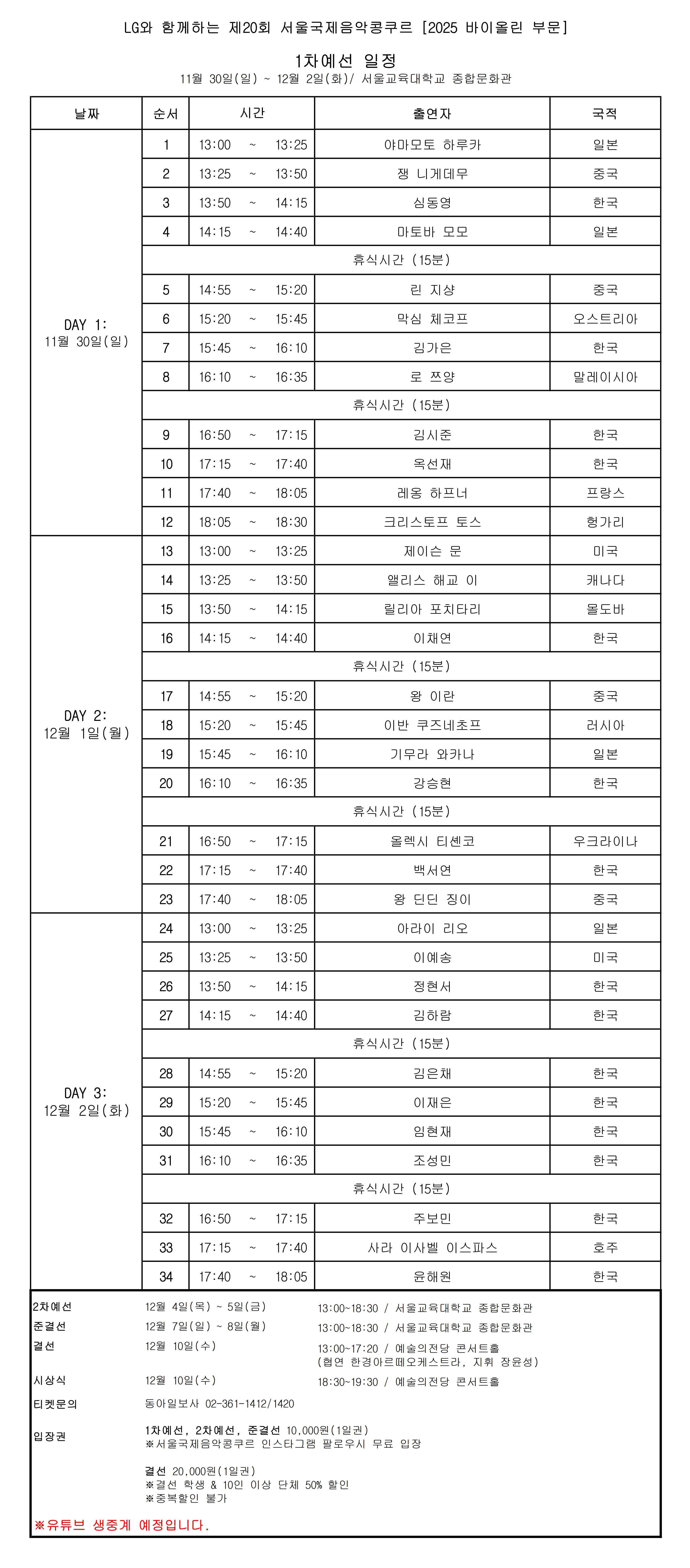 제20회 서울국제음악콩쿠르 바이올린부문 1차 예선 일정 작성자 concours 작성일 2025-11-28 15:49 조회 1217 좋아요 0 싫어요 0 인쇄 « 제20회 서울국제음악콩쿠르 예비심사 합격자 명단 (2025 VIOLIN) 제20회 서울국제음악콩쿠르 1차 예선 합격자 명단 » 목록보기 Powered by KBoard