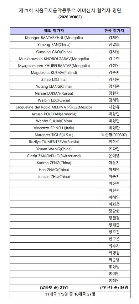 제21회 서울국제음악콩쿠르 예비심사 합격자 명단 (2026 VOICE) 작성자 concours 작성일 2026-02-11 17:41 조회 1447 좋아요 0 싫어요 0 인쇄 « 제21회 서울국제음악콩쿠르 성악부문 예심합격자 국가별 현황 제21회 서울국제음악콩쿠르 성악부문 1차 예선 일정 » 목록보기 Powered by KBoard