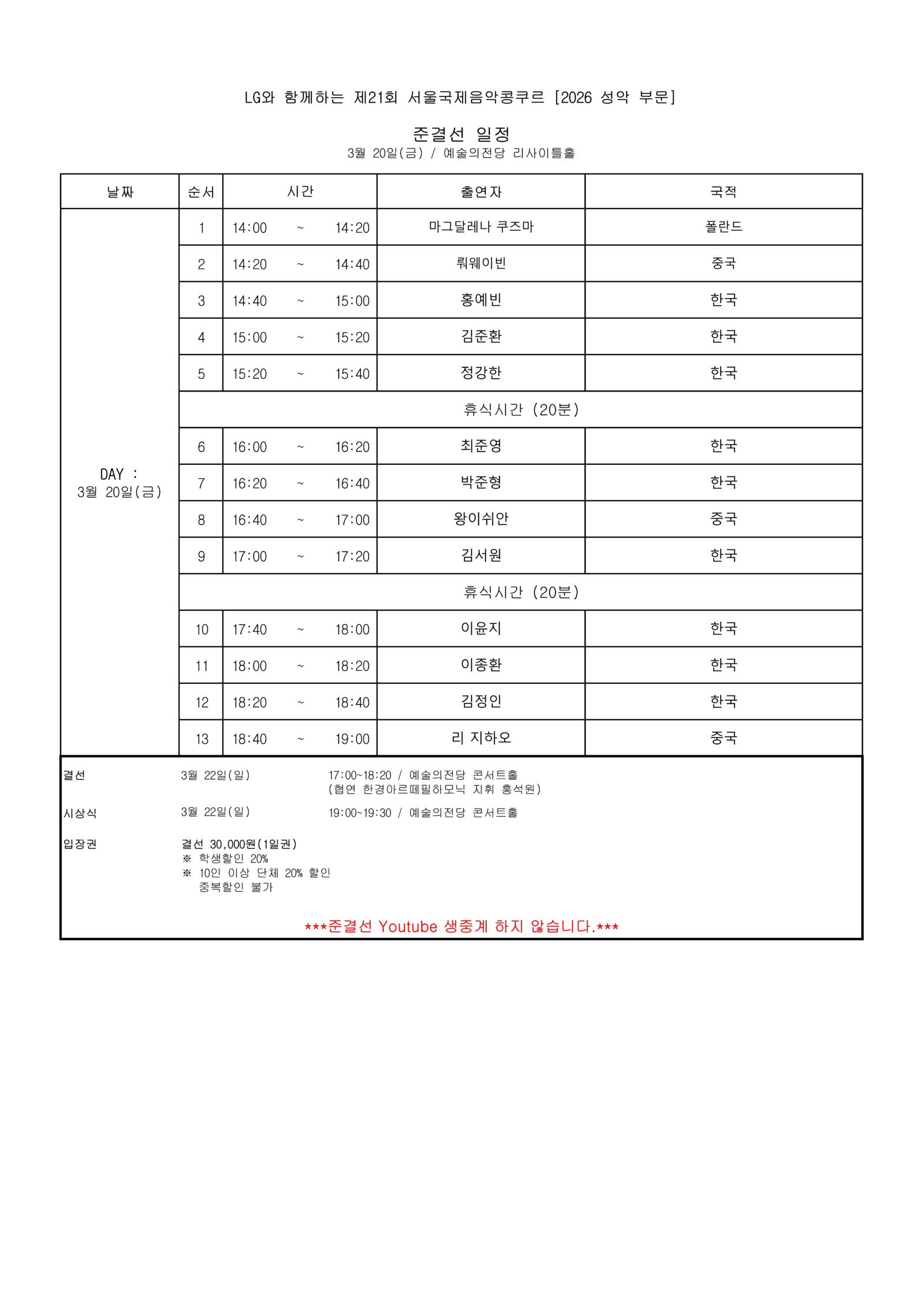 제21회 서울국제음악콩쿠르 준결선 일정 작성자 concours 작성일 2026-03-18 23:34 조회 1535 좋아요 0 싫어요 0 인쇄 « 제21회 서울국제음악콩쿠르 2차예선 합격자 명단(성악 부문) 제21회 서울국제음악콩쿠르 특별상 - 김순남 특별상 » 목록보기 Powered by KBoard